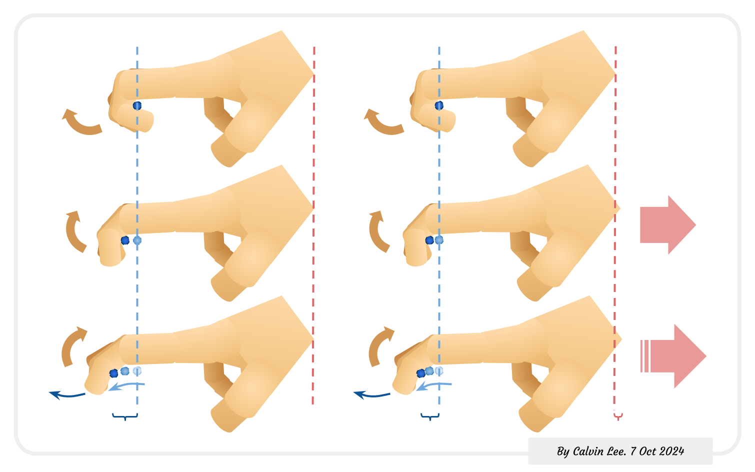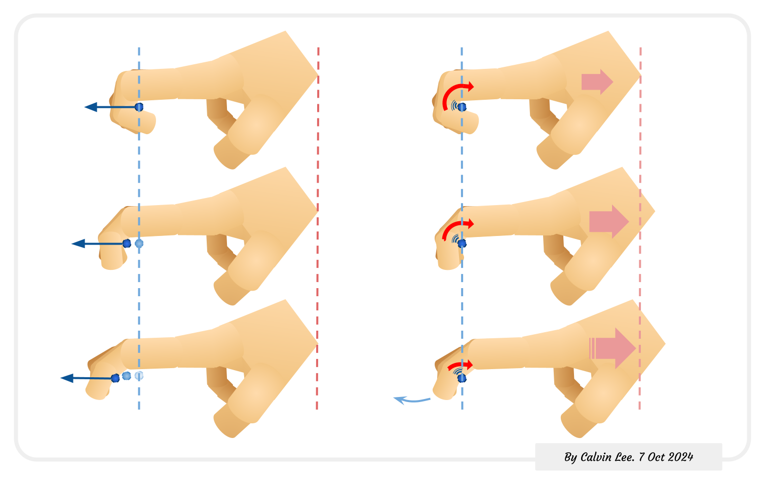 奧運選手的基礎射箭知識資料入面嘅講法上面已經引述過,資料內有形容於放箭時手指係點(拉橡筋練習):
