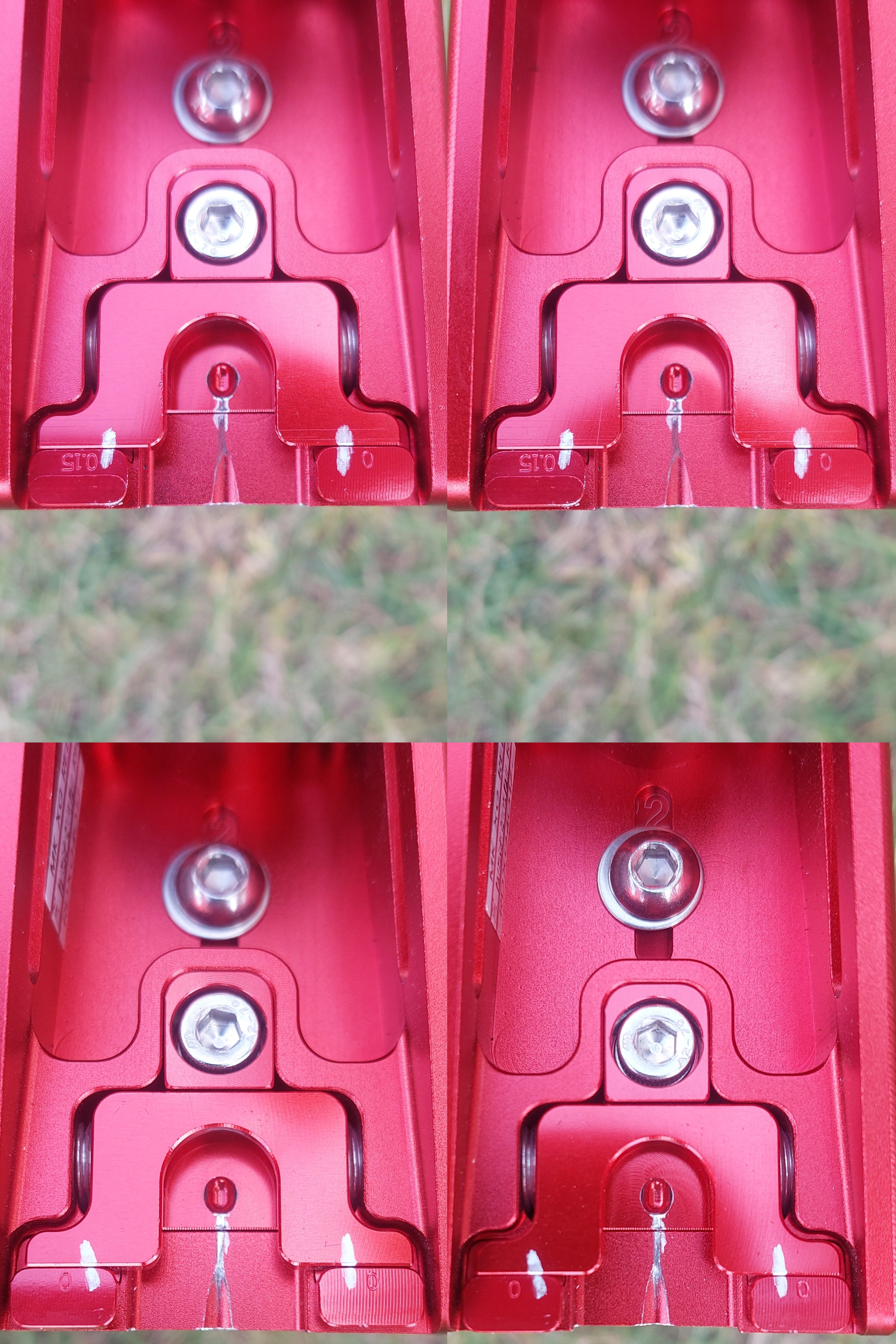 今次我調校嘅幅度好細,只係將弓片上下同時向左邊推1/8圈。1/8圈有幾小?就係較alignment粒螺絲一圈啞嘅1/8。我求其用漆油筆畫兩條刻度喺插槽內,調校前後見唔到有明顯差異,而limb guage或者中央平衡桿方向就更加唔洗講,肉眼睇唔到有咩分別,