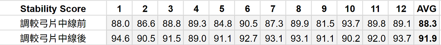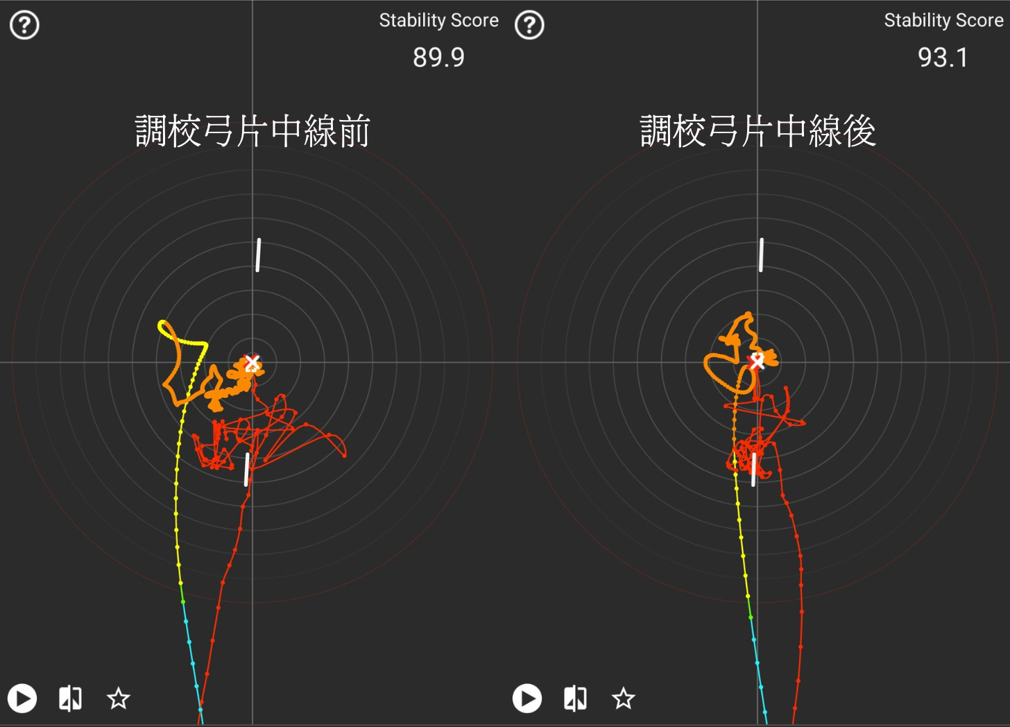 我調弓習慣主要憑感覺,不過同時都有用MantisX8分析做參巧。調校後評分平均竟然高咗三分,較之前記錄12錄箭,較之後都係射12箭。