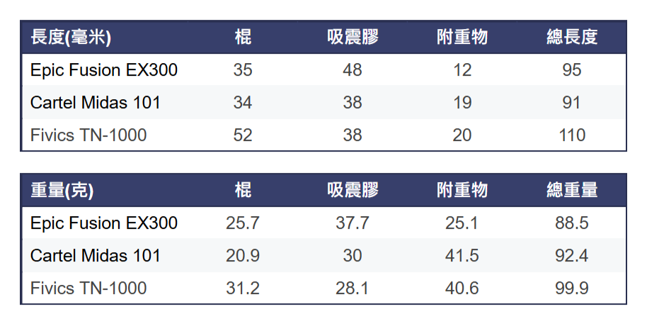 Epic同Cartel長度同重量數字上會係咁,我加埋用緊嘅Fivics 上香TN-1000做比較: