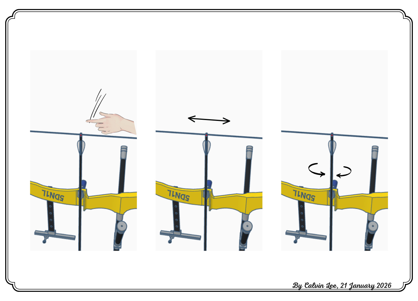 因為過往教校隊每隊人數眾多,砌過預調過好多把弓,久而久之建立咗一個順序,每次都係按一個順序去裝組。次序主要係習慣,並唔係話我個次序最好,但如果你砌弓砌得唔多,就比我更需要確立一個習慣,以確保唔會做漏嘢,同時亦都可以減低要番轉頭再調嘅風險。