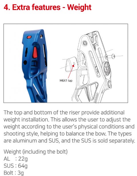 但其實跟弓有兩舊鋁合金weight,每粒22g,分別裝喺弓身上下兩個limb pocket位後面,加埋兩粒螺絲總重就會係1,310g,咁就同其他弓身差唔多。依然係覺得唔夠重可以另外買SUS不鏽鋼版weight,64g一粒。
