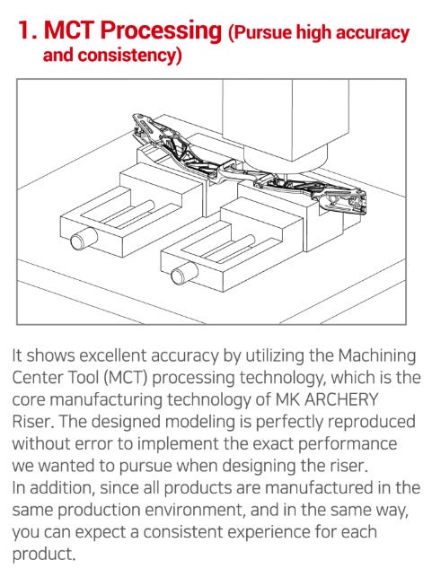MK其他頂級弓身都係用AL7075,係中價弓例如MK X ON先用AL6061,今次MK XG亦都無例外係AL7075。而喺官網啲介紹入面就提到生產時用咗Machining center tool MCT生產技術。而呢個MCT技術佢話係「core manufacturing technology of MK ARCHERY Riser」,咁會唔會係之前嘅頂級弓身都有用緊呢個生產方法,並非新嘢?