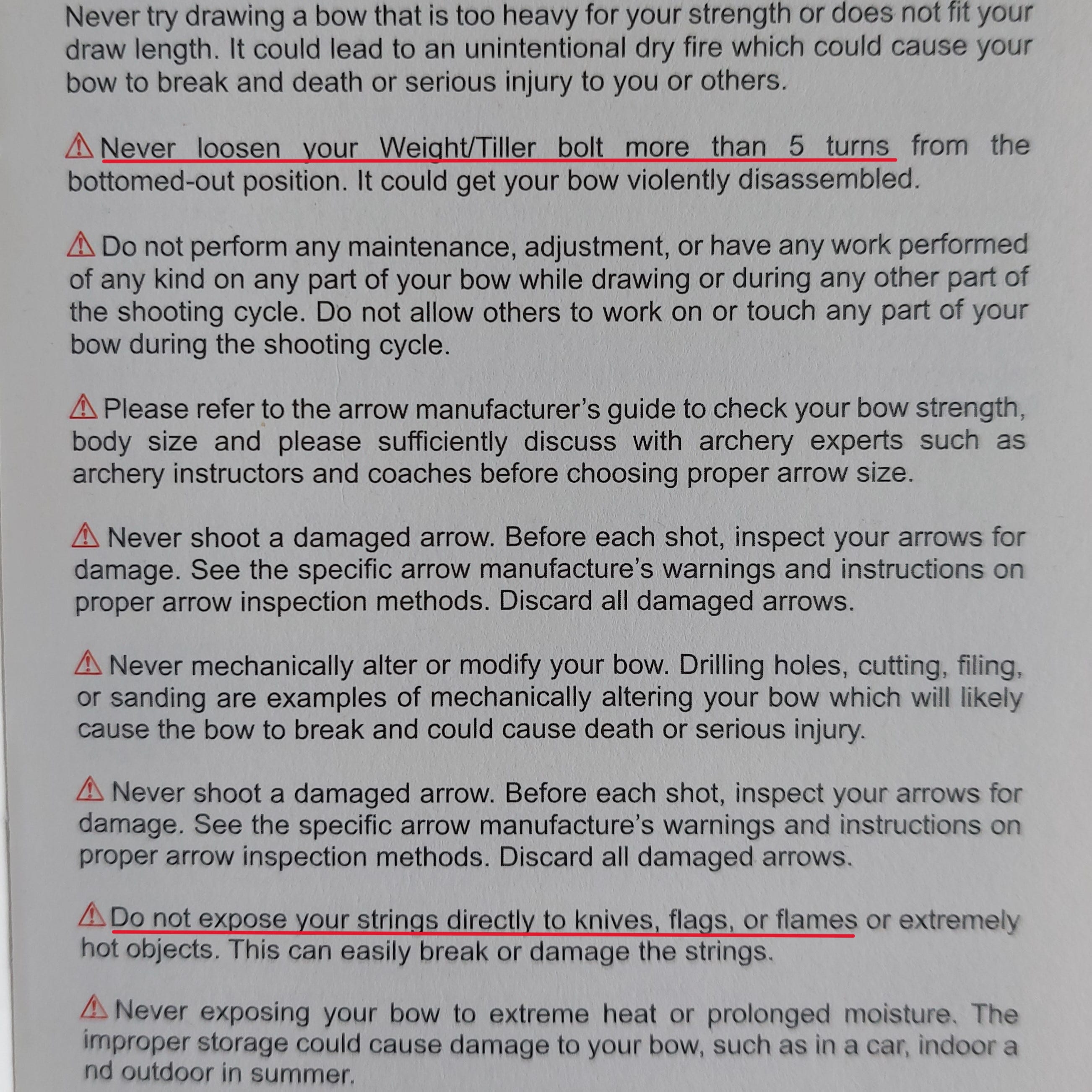 維修保養指引內容有兩點我想提一提,第一係tiller弓檔可以扭幾多,唔係所有廠都會清楚寫明,通常要靠射手教練經驗斷估,MK就說明弓檔由扭到底計起最多可以鬆5圈。第二佢話唔好正接用火燒條弦,可能你會諗邊有人會咁做?但我見過唔少人燒護弦線燒搭箭點埋口係個火直接橫跨過條弦黎燒嘅,咁最好就安全啲唔好咁做。
