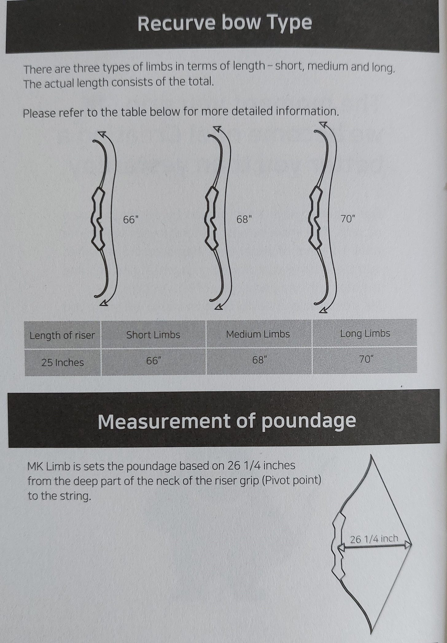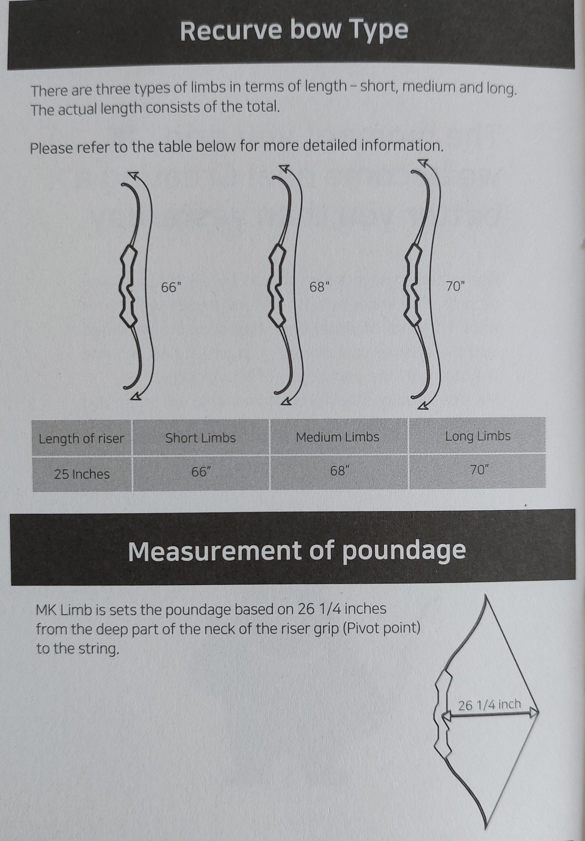 而說明書亦都好好清楚寫明啲基本嘢,例如度拉磅係計弓身pivot point支點拉開26寸1/4,即係true draw length,唔洗你諗把弓身邊緣係唔係28寸加唔加1寸3/4之類咁複雜。弓身配唔同長度弓片需要嘅弦距建議亦都有寫清楚,不過啲數字厘米同寸嘅換算好似唔係好對。另外我亦都好鍾意佢講弓長度副圖,佢有清楚劃出66、68、70寸係整把弓鬆弦時曲線量度長度,而唔係直線。各個唔同配件同各項調整方法亦都有非常詳細說明,圖文並茂,如果本身無乜調弓經驗,本說明書係幾大幫助,望住佢會畀到你信心去嘗試扭啲螺絲。