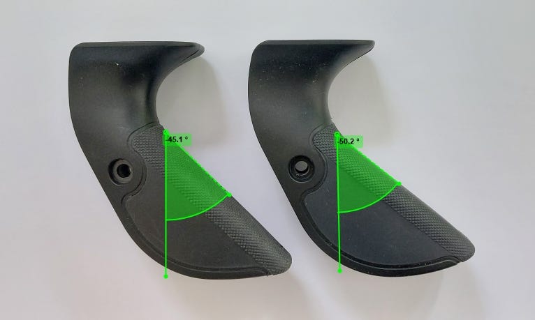 一如其他MK弓身,跟兩隻膠握把一中一高,上面有防滑紋。搵唔到資料有講兩隻握把分別係幾高,咁就大約度一度。低嘅一隻大概係45度,高嘅係50度,即係咩概念?借同R-Core資料比較,R-Core中係38度,高先係45度。