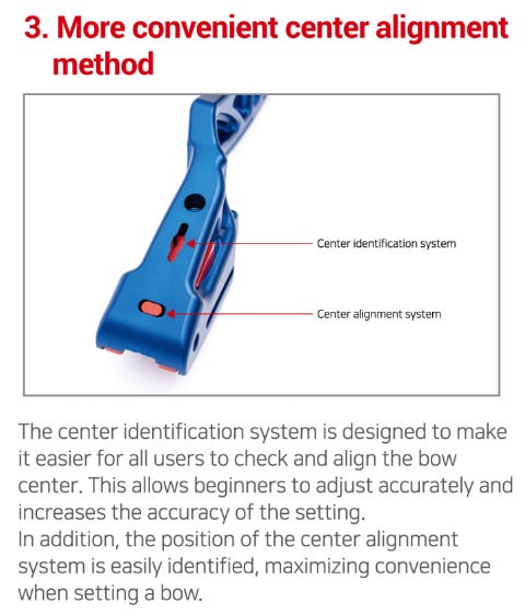 Center identification system就係弓身背後個長條形窿,用黎對弓弦調較弓片中線,直身長條形上下窄中間闊少少設計都幾易睇。呢個只係調較弓片中線嘅一部份,不過官網就將其作為一個賣點特別分開提及。我比較貪心,覺得如果個Center Alignment System底部外露位置再加多一個刻度就更容易對位。