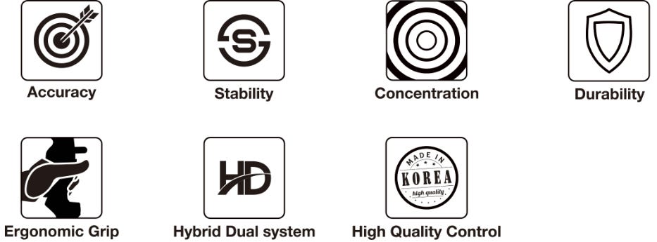 官網介紹MKXG足足有7個無乜意義嘅icon,唯一能夠吸引到我嘅係High Quality Control個logo內寫住嘅Made in Korea。其餘有啲icon都幾好笑,當中有兩個分別係寫accuracy同stability,斷仲佢唔會有把係sell inaccurate同unstable掛?而且再望吓其他型號,原來佢所有弓身介紹都有呢兩個icon。