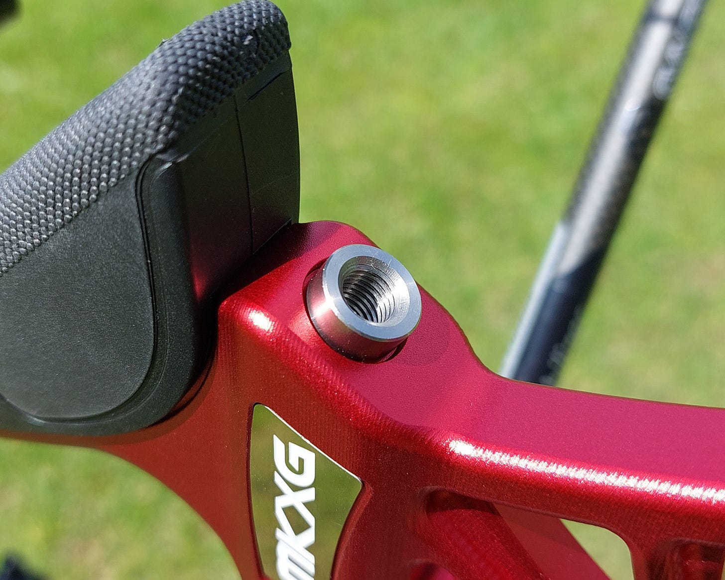 冬茹外觀正正常常,全金屬面頭有啲花紋,暫時未知容唔容易生鏽,同牌子另一隻弓身MK X ON粒冬茹就好快生鏽,但外觀唔係同一個款。冬茹無咩特別好講,反而我想講冬茹後面嘅窿。一般調較金屬製弓身時我哋會用呢個螺絲窿黎對位,調較弓片中線,因為呢個窿位應該要做得準確需要絕對喺正中間。但今次咁就出事,MKXG除咗有螺絲窿仲有另一個官方窿Center Identification System嘅窿用黎對位較弓片中線,喂大佬兩個窿唔對位嘅?