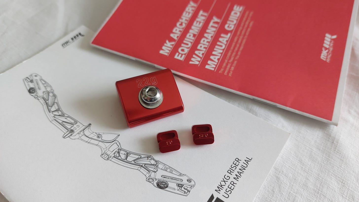 跟個弓身自然有弓袋,仲有專用weight兩粒、調較弓片水平嘅配件、另一隻握把、同埋一抽六角匙加螺絲批。如果唔係打食評,我都未必會特別去睇本說明書,但我亦都興幸有去睇本說明書(MKXG Riser User Manual)同維修保養指引(MK Archery Equipment Warranty Manual Guide),因為我都睇得幾開心。兩本manual都有用四種語文韓文、英文、日文同殘體中文字,內容唔好期望翻譯得超準確,但係係睇得明嘅唔係網上亂譯。而本維修保養指引最後亦都有講少少品牌理念同介紹生產,不過就淨係得英文,唔理內容,單係加入品牌介紹呢個動作本身就令到我覺得個品牌係有心去做嘅。